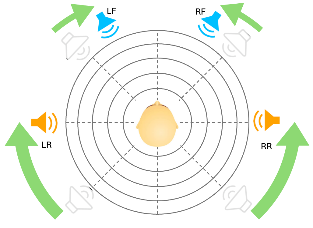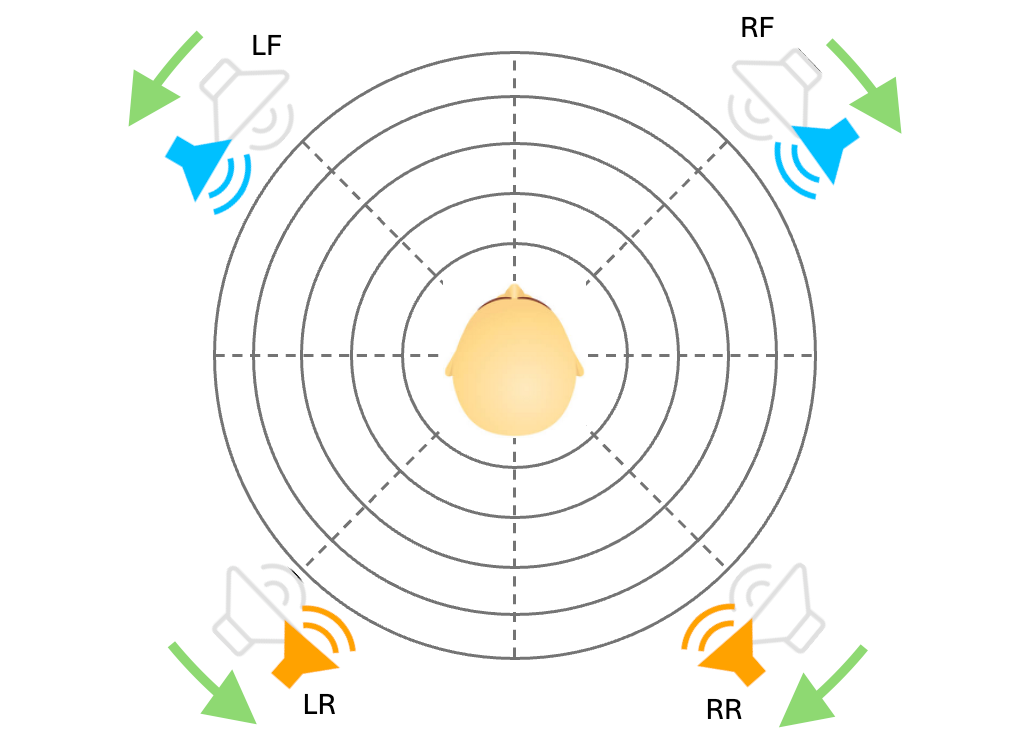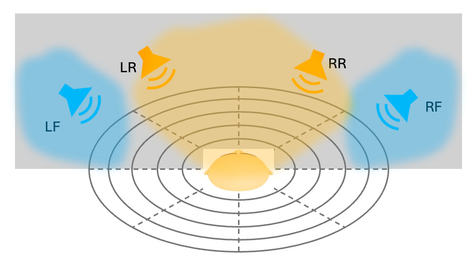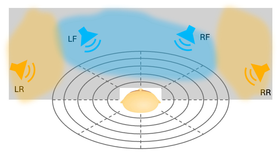 To be absolutely sure I did some tests in my studio with a dummyhead recording and analyzed the recording of each separate channel. What I found was that the front speakers indeed are more directional and the rear speakers are a mixture of reflected and direct incoming signals. But the mix of reflected and direct signals has a different balance. Where in the front the ratio of direct vs reflected signal is something like 65%-35%, in the rear it’s closer to 50%-50%. But in any case it’s certainly not 100% left or right.