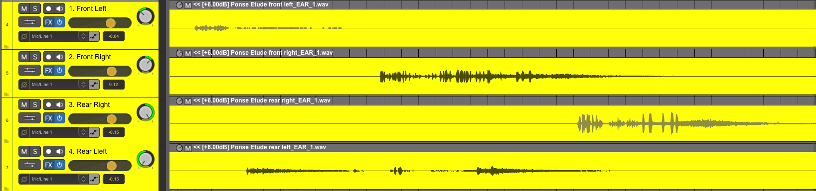 Below you can listen to the differences. This is an excerpt of Luctor Ponse’s Etude 1. The yellow waves in the picture above can be heard in the examples. You can hear the various individual parts quite well in this piece. Best heard through headphones, but it also ‘works’ with loudspeakers.