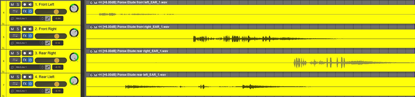 I am currently restoring and remixing quadrophonic compositions by Dutch composer Luctor Ponse. Like I wrote in this article, we intend to work towards a new binaural mix (to be released in 2026). The works themselves have been composed as a quadrophonic setup, to be presented in a live tape-concert. This was not unusual in those days.